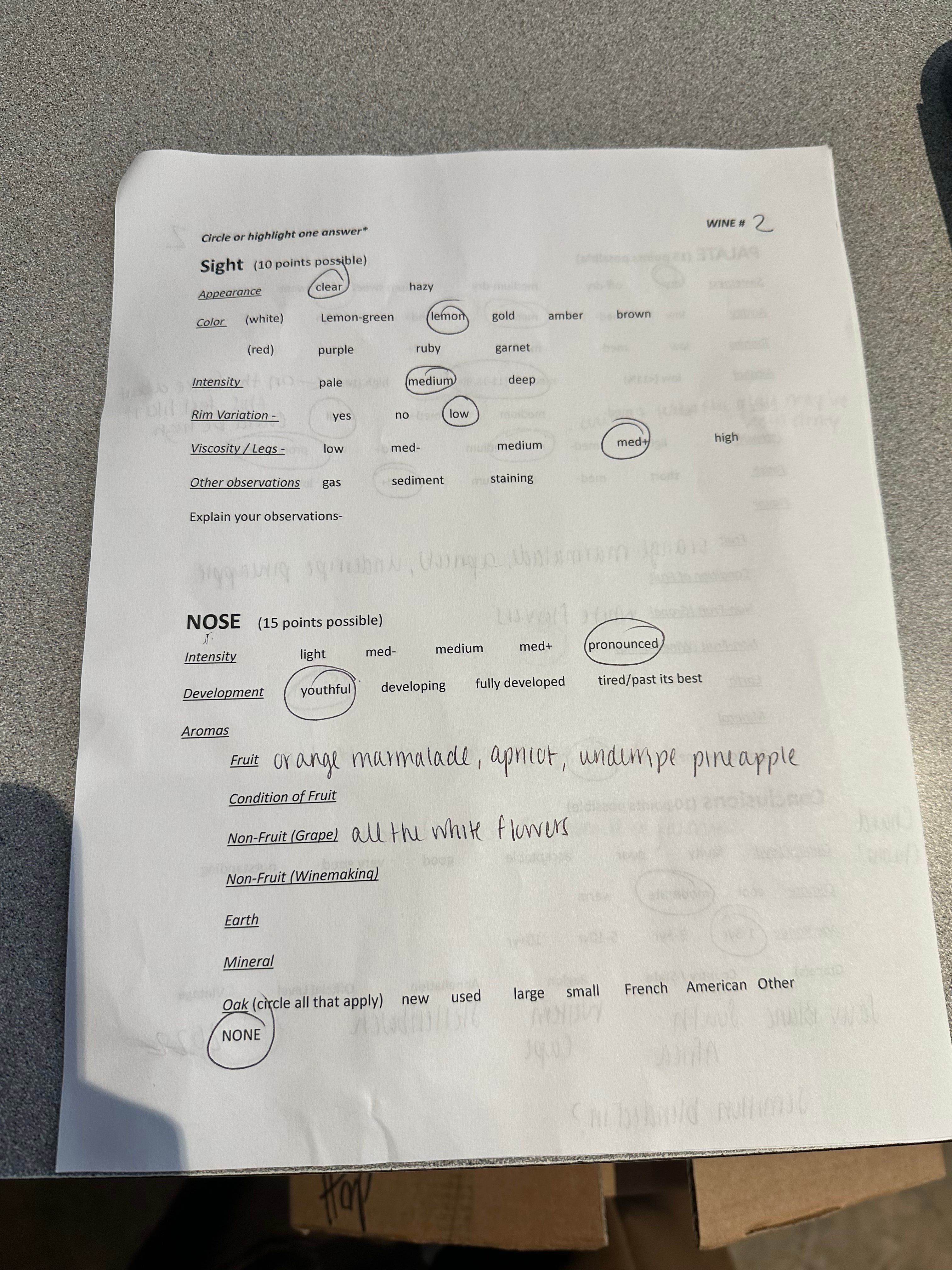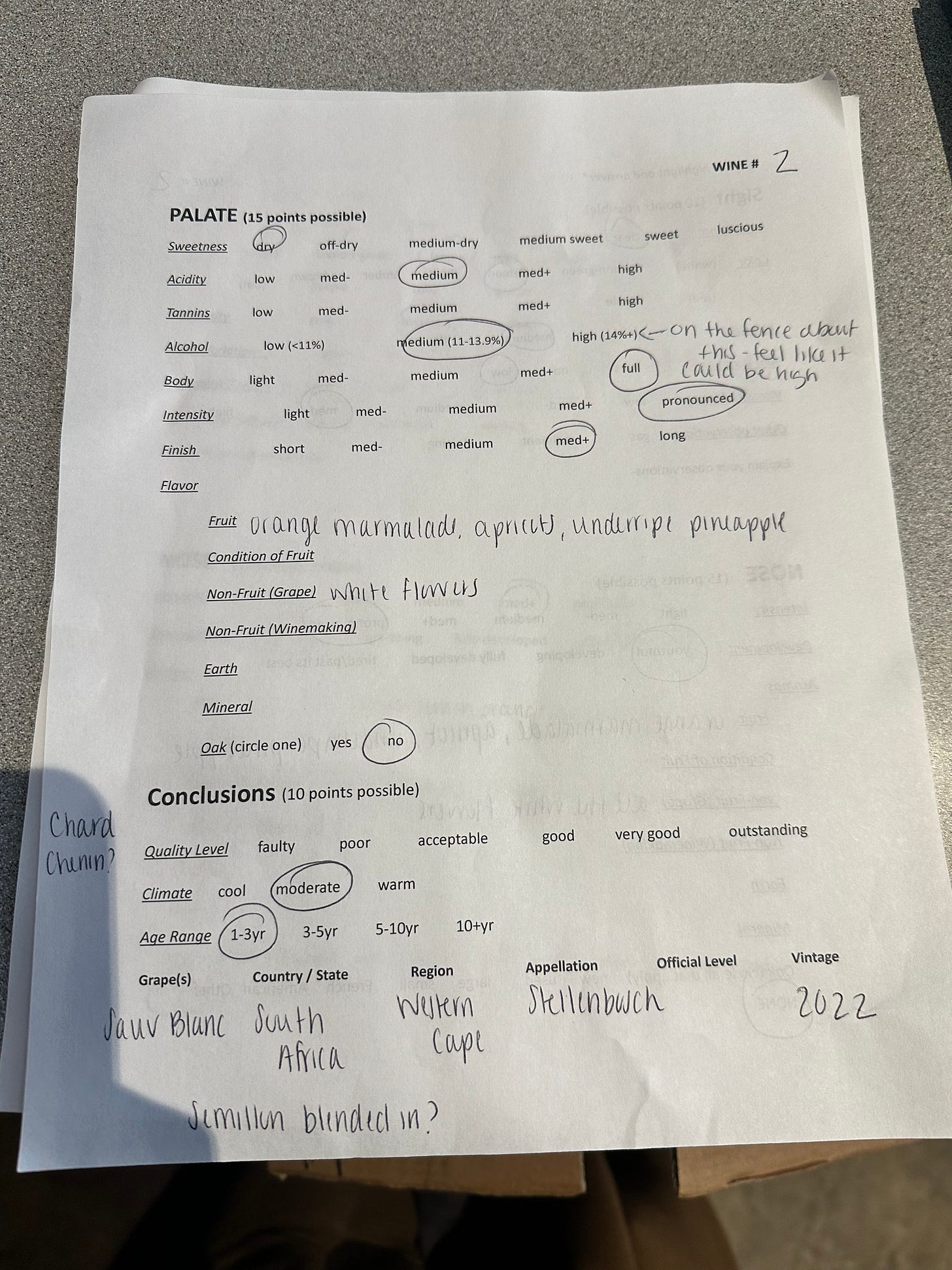 My assessment sheet for one of the wines in a previous flight. You can see on the left of the second picture that my initial calls were Chardonnay and Chenin Blanc. I knew this flight was the same grape variety from four different places, so I just had to get the grape to figure out where in the world these wines were from. It wasn’t until Wine 4 of this flight that I got typical (to me) Sauvignon Blanc notes. This wine was a Graves, not a South African Sauv Blanc. It did have Semillon blended in (yay), but otherwise this wine didn’t present like a typical Bordeaux Blanc (to me). Usually Bordeaux Blanc smells like straight up cat piss. I learned a lot with this particular wine.