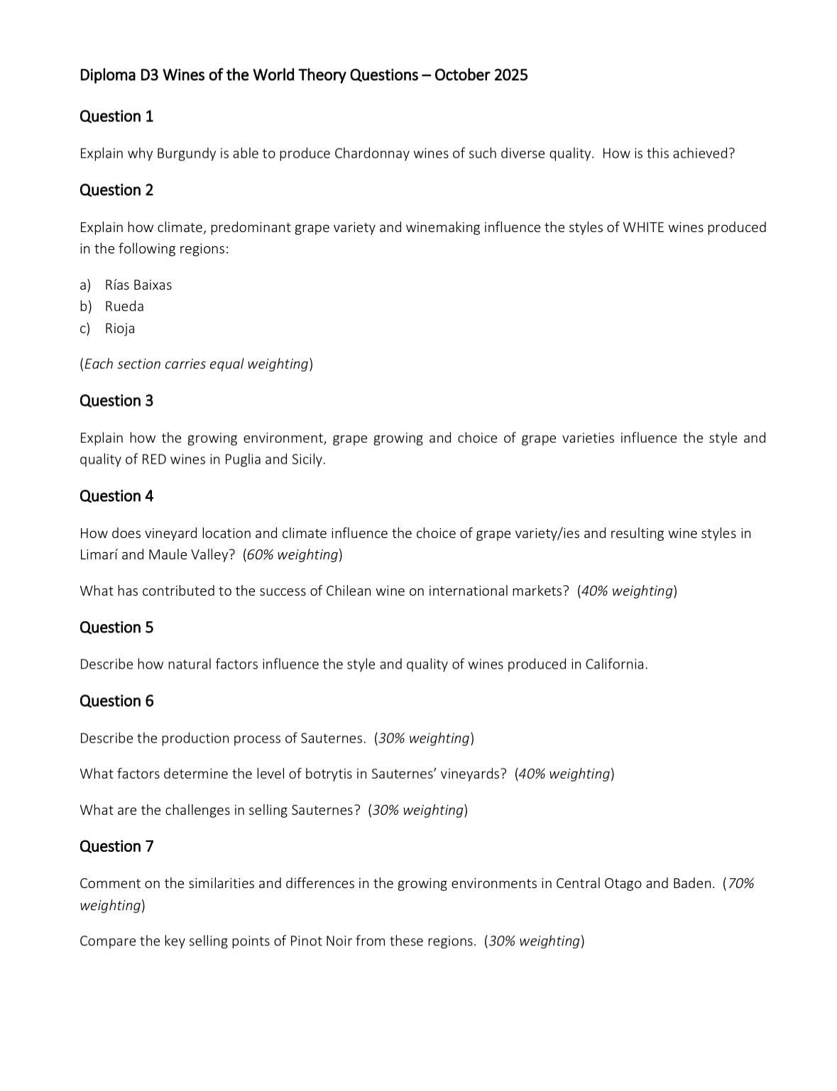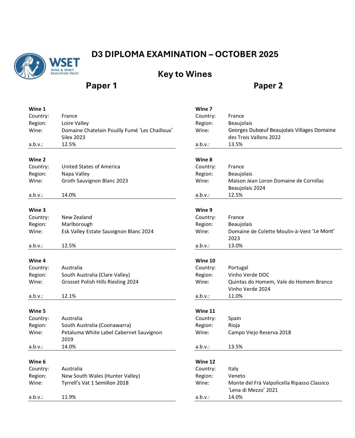 The exam wines (released a day after the exam) are below: